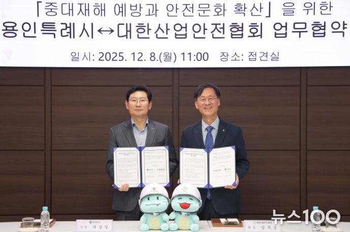 뉴스100 김동초 기자 | 용인특례시는 8일 시청 4층 접견실에서 대한산업안전협회와 ‘중대재해 예방과 안전문화 확산을 위한 업무협약’을 맺었다.