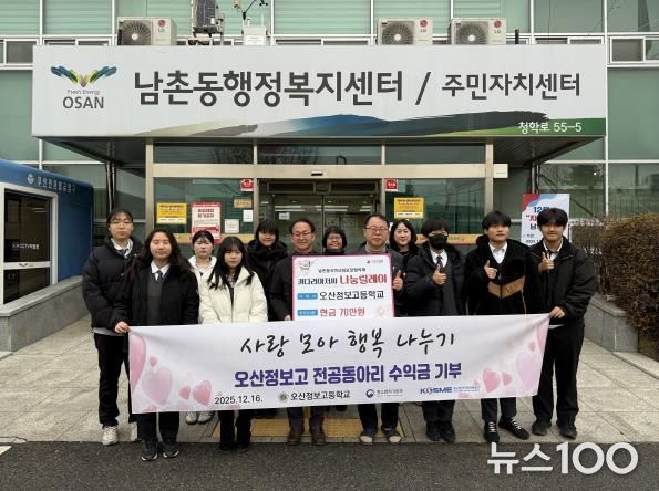 뉴스100 김동초 기자 | 오산시 남촌동행정복지센터는 지난 16일 오산정보고등학교 전공동아리 학생들과 주훈지 교장, 담당교사 등이 참석한 가운데 관내 저소득층 지원을 위한 바자회 판매 수익금 70만 원을 기탁받았다고 밝혔다.