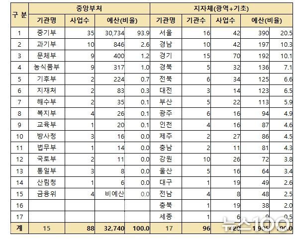 지방자치단체(광역 17개, 기초 79개)는 서울(390억원), 경남(197억원), 경기(192억원) 등에서 총 1,905억원, 420개 사업을 추진할 계획이다.