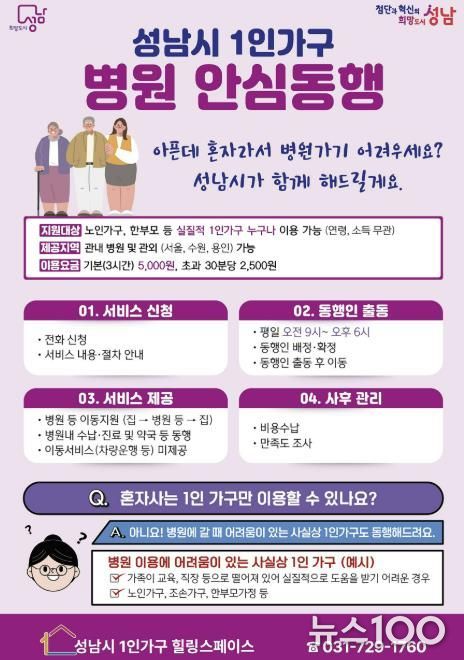 뉴스100 김동초 기자 | 성남시는 ‘1인 가구 병원 안심 동행 서비스’ 추진을 위해 전문 인력을 기존 4명에서 5명으로 늘렸다고 22일 밝혔다.