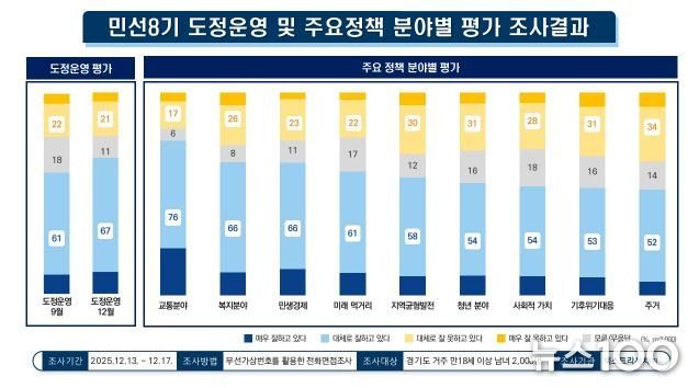 경기도가 여론조사 전문기관 넥스트리서치에 의뢰해 12월 실시한 여론조사 결과, 경기도정 운영을 ‘잘하고 있다’는 응답은 67%로 집계됐다. 이는 동일한 조사 설계로 실시한 9월 61%보다 6%p 상승한 수치다. 반면, 도정 운영을 ‘잘 못하고 있다’는 응답은 21%로 9월 22% 대비 1%p 하락했다.