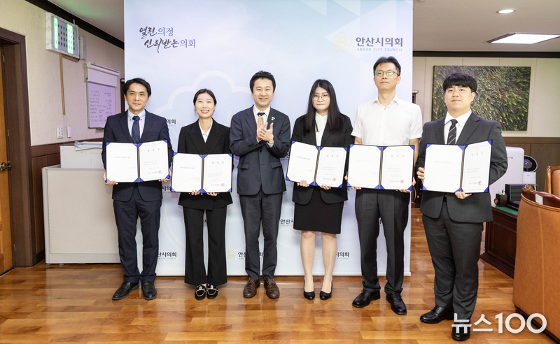 사진 설명: 안산시의회가 최근 일반직 공무원 공채를 통해 선발한 인력에 대한 배치를 마쳤다. 사진은 지난 18일 의장실에서 열린 신규공무원 임용식의 모습.
