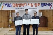 뉴스100 김동초 기자 | 가평군 가평읍 행정복지센터는 최근 가평읍지역사회보장협의체(지사협), 유일닭강정과 ‘맞춤형복지 지원 업무협약’을 체결했다. 이번 협약으로 유일닭강정은 매월 가평읍 맞춤형복지팀에서 추천한 저소득계층 10가정에 닭강정을 지원해 주기로 했다. 장석조 가평읍장은 “복지사각지대 발굴뿐 아니라 민간 자원 연계가 복지 수준을 높이는 데 큰 역할을 한다”며 “이번 협약이 공공자원만으로는 충족하기 어려웠던 복지수요를 보완하는 데 큰 도움이 될 것”이라고 말했다. 유병훈 유일닭강정 대표는 “우리 지역 주민들과 마음을 나누고 싶어 맞춤형복지 지원 협약에 참여했다”며 “앞으로도 어려운 이웃을 위한 나눔과 봉사를 꾸준히 실천하겠다”고 밝혔다. [뉴스출처 : 경기도 가평군]