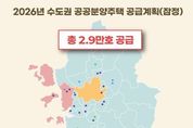 뉴스100 김동초 기자 | 국토교통부와 4개 공공기관은 ’26년 수도권 공공택지에서 총 2.9만호 규모의 공공분양주택을 순차적으로 공급할 계획이라고 밝혔다. 이번 공급 물량은 새정부 「주택공급 확대방안」(9·7대책)에서 발표한 수치(2.7만호) 대비 약 2천호 증가한 규모로, 판교(2.9만호)급 신도시를 하나 새로 조성한 것에 준하는 수준이다. 특히, 4개 공공기관의 올해 분양 물량(2.2만호)보다 32.2% 증가했고, 최근 5년간 평균 수도권 분양 물량(1.2만호)의 약 2.3배 수준으로, 공공 부문의 착공 확대 노력의 성과가 가시화되며, 공급 확대 국면으로 전환되고 있음을 보여준다. 내년에 분양될 단지들을 살펴보면, 지역별로는 △서울 1.3천호, △인천 3.6천호, △경기 23.8천호로 분포되어 있고, 주요 지구별로는 △3기 신도시 7.5천호, △2기 신도시 7.9천호, △기타 중소택지 13.2천호의 공공주택이 분양될 예정이다. 3기 신도시에서는 △고양창릉(3,881호), △남양주왕숙(1,868호), △인천계양(1,290호), 2기 신도시에서는 △광교(600호), △평택고덕(5,134호), △
