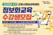뉴스100 김동초 기자 | 군포시는 시민들의 정보화 시대에 대한 적응 능력 향상 및 정보 소외 계층의 디지털 격차 해소를 위해 운영되는 ‘2025년 4기 시민정보화교육’의 수강생을 오는 10월 15일부터 10월 19일까지 모집한다고 13일 밝혔다. 이번 교육은 컴퓨터와 스마트기기 기초 사용법부터 최신 인공지능(AI) 활용 기술까지 다양한 주제로 구성되며, 군포시민을 대상으로 총 10개 강좌가 운영된다. 수강료는 무료이나, 강좌에 따라 교재를 개별 구매해야 할 수도 있다. 수강신청은 2025년 10월 15일 오전 10시부터 10월 19일 오후 6시까지 가능하며, 군포시청 홈페이지 또는 군포시 정보교육센터(산본로324번길 8, 504호, 주말 휴무) 방문을 통해 신청할 수 있다. 이번 교육에서는 컴퓨터나 스마트폰에 익숙하지 않은 초보자를 대상으로 하는 ▲컴퓨터 기초 ▲스마트폰 기초 및 활용 ▲실용인터넷 강좌 뿐만 아니라 실생활과 업무에 유용한 ▲속성 한글 ▲엑셀 기초 ▲스마트폰 중급 강의도 포함되어 있다. 또한 최신 기술을 반영한 ▲동영상 제작 ▲3D 프린팅 ▲ChatGPT · 생성형AI ▲AI활용 유튜브 콘텐츠
