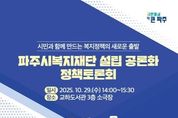 뉴스100 김동초 기자 | 파주시는 오는 29일 14시, 교하도서관 3층 소극장에서 ‘파주시복지재단 설립 공론화 정책토론회’를 개최한다고 밝혔다. 이번 토론회는 파주시복지재단 설립을 앞두고 시민, 전문가, 현장 종사자의 다양한 의견을 수렴해 재단 설립의 필요성과 발전 방향을 함께 모색하기 위해 마련됐다. 토론회는 김민철 서영대학교 사회복지행정학과 교수의 기조 강연을 시작으로, 파주시 복지기획팀장의 주제 발표가 이어진다. 이어 한지원 두원공과대학교 교수가 좌장을 맡아 토론을 진행하며, 이보경 파주시문산종합사회복지관 관장, 오민수 경기복지재단 선임연구위원, 박윤근 화성시복지재단 사업본부장 등이 참석해 열띤 논의를 펼칠 예정이다. 토론에서는 ▲파주시복지재단 설립의 필요성과 추진 개요 ▲파주시 여건을 반영한 복지재단의 발전 방향 ▲재정 자립 및 지속가능성 확보 방안 등 다양한 주제가 심도 있게 논의될 예정이다. 김은숙 복지정책국장은 “파주시복지재단은 시민의 삶을 보다 세밀하게 지원하고, 지역 현장의 목소리를 반영한 ‘파주형 복지모델’을 실행할 구심점이 될 것”이라며, “이번 토론회를 통해 파주시 복지 정책