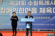뉴스100 김동초 기자 | 수원특례시의회(의장 이재식)는 9일(화), 수원실내체육관에서 열린 ‘제21회 수원특례시 장애인 한마음 체육대회 개회식’에 참석해 선수단을 격려했다. 이날 행사에는 이재식 의장을 비롯한 수원특례시의회 의원, 수원시장애인체육회와 수원시장애인복지단체연합회 관계자, 선수 400여 명과 보호자, 심판 등이 함께해 대회의 열기를 더했다. 이재식 의장은 축사를 통해 “이번 대회는 누가 더 잘하느냐의 경쟁보다 함께 뛰고 웃으며 서로의 마음을 나누는 자리가 되길 바란다”며, “수원특례시의회는 장애인 여러분이 스포츠를 통해 도전과 열정을 마음껏 펼칠 수 있도록 지속적으로 관심을 가지고 아낌없이 지원하겠다”고 밝혔다. 한편, 이번 대회는 수원시장애인체육회와 수원시장애인복지단체연합회가 주최·주관했으며, 슐런·투호·한궁·육상·족구 등 12개 종목에서 선수들이 기량을 겨루며 화합의 장을 만들었다.