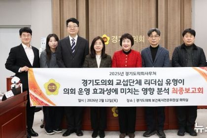 뉴스100 김동초 기자 | 경기도의회 보건복지위원회 소속 지미연 의원(국민의힘, 용인6)은 12일 「경기도의회 교섭단체 리더십 유형이 의회운영 효과성에 미치는 영향 분석」 정책연구용역 최종보고회에 참석했다. 이번 연구용역은 지방의회 내 교섭단체의 리더십 유형이 의회 운영 성과에 미치는 영향을 실증적으로 분석하고, 이를 뒷받침할 법적·제도적 인프라를 구축하고자 지미연 의원의 제안으로 추진되었다. 이날 보고회에서 책임연구자인 김선희 경인행정학회 회장(한경국립대학교 행정학전공 교수)은 언론보도 분석과 심층 인터뷰 결과를 종합하여 경기도의회 시기별 교섭단체의 리더십 전개 양상과 특성을 설명했다. 또한 리더십 강화를 위한 4대 전략으로 △교섭단체 운영의 안전성 확보 △교섭단체 운영 체계화 및 내부역량 강화 시스템 마련 △의회의 정책 주도권 확보를 위한 인프라 확충 △교섭단체 리더십 평가 및 환류시스템 구축을 제안했다. 지미연 의원은 “이번 연구는 설문조사와 실증적 조사를 바탕으로 교섭단체 리더십의 특징을 정밀하게 분석하고, 리더십 강화를 위한 구체적인 법·제도 개선 방안을 마련했다는 점에서 매우 뜻깊은 성과”라고 평가했