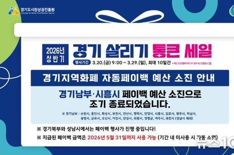 뉴스100 김동초 기자 | 경기도시장상권진흥원은 도내 소상공인 매출 증대와 지역경제 활성화를 위해 추진하고 있는 ‘2026년 상반기 경기 살리기 통큰 세일’(이하 통큰 세일)이 도민들의 높은 참여 속에 일부 지역에서 조기 소진됐다고 25일 밝혔다. 이번 통큰 세일은 소비 비수기인 3월에 맞춰 지난 20일 오전 9시부터 경기지역화폐 기반 페이백 방식으로 시작됐다. 70억 원 규모로 29일까지 운영 예정인 가운데, 도민들의 적극적인 참여로 지난 24일 남부지역을 중심으로 예산이 소진되며 일부 지역에서 행사가 조기 종료됐다. 현재 남부지역은 대다수 소진되고 있으며 그 외 북부 지역은 29일 또는 예산 소진 시까지 운영된다. 아울러 배달특급, 땡겨요, 먹깨비 등에서 2만 원 이상 주문 결제 시 5천 원 할인쿠폰을 지원하는 공공배달앱 소비 촉진 행사는 행사기간 내 쿠폰소진 시 까지 추진될 예정이다. 경상원은 경기지역화폐 기반 자동 페이백 방식이 소비자의 편의성을 높여 조기 소진 성과를 이뤘다고 평가했다. 특히 지급받은 페이백을 즉시 사용할 수 있어 추가 소비를 유도하며 상권 매출 증가로 이어진 것으로 봤다