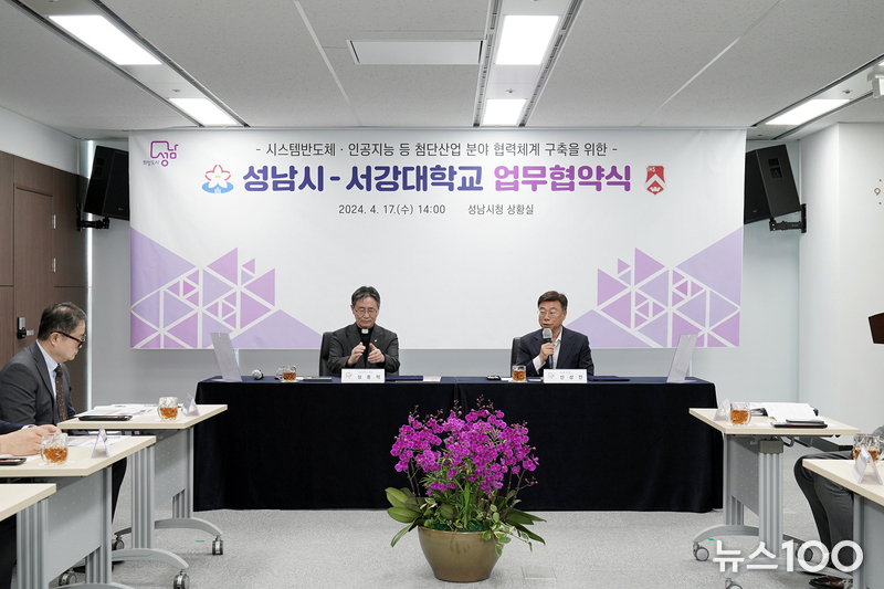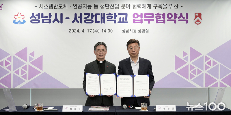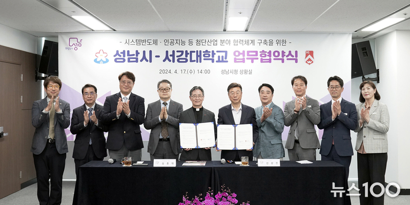 성남시는 17일 오후 2시 성남시청 상황실에서 신상진 성남시장, 심종혁 서강대 총장, 한국팹리스산업협회 김경수 회장 등이 참석한 가운데 ‘시스템반도체‧인공지능 등 첨단산업 분야 맞춤형 인재 양성 및 협력체계 구축을 위한 업무협약을 체결했다.
