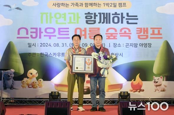 뉴스100 김동초 기자 | 오산시는 지난 31일 한국스카우트연맹 곤지암야영장에서 열린 자연과 함께하는 스카우트 여름 숲속캠프에서 이권재 시장이 한국스카우트연맹에서 수여하는 최고 훈장인 무궁화금장을 수상했다고 밝혔다.