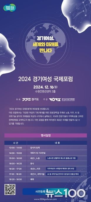 뉴스100 기자 | 경기도가 ‘여성의 기회 확대를 위한 포용정책’을 주제로 국내외 여성 전문가들과 정책방향을 모색하는 ‘2024 경기여성 국제포럼’을 개최한다.
