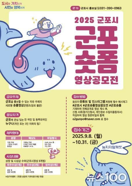 뉴스100 김동초 기자 | 군포시는 시민 참여형 영상 콘텐츠 발굴을 위해 오는 9월 8일부터 10월 31일까지 2025 군포시 숏폼영상 공모전 ‘군포숏폼’을 개최한다고 밝혔다.