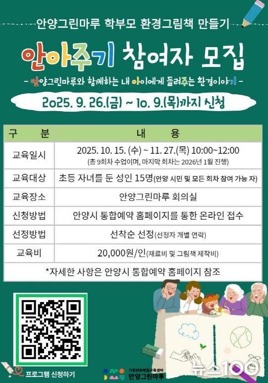 뉴스100 김동초 기자 | 안양시가 기후변화체험교육센터 안양그린마루에서 오는 10월부터 11월까지 8회에 걸쳐 학부모를 대상으로 한 교육프로그램 ‘안아주기(안양그린마루와 함께하는 내 아이에게 들려주는 환경이야기)’를 운영한다고 29일 밝혔다.