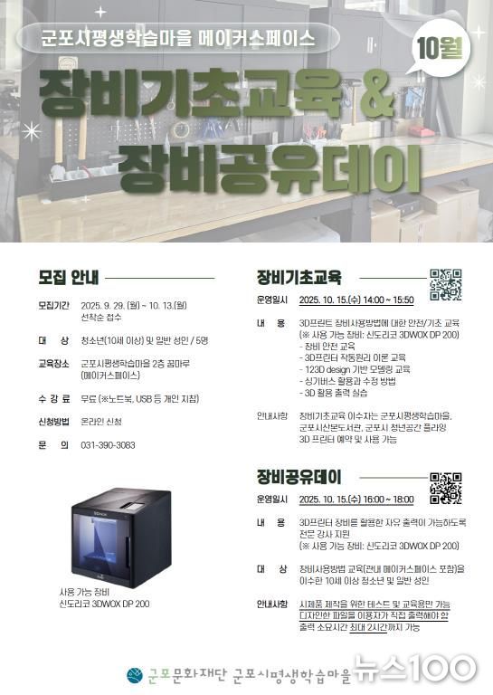 뉴스100 김동초 기자 | (재)군포문화재단은 오는 10월 15일, 지역 청소년과 성인을 대상으로 디지털 제작 장비를 활용한 ‘3D프린터 장비기초교육’과 ‘장비공유데이’를 운영한다.