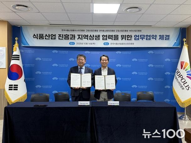 뉴스100 김동초 기자 | 군포산업진흥원은 10월 16일 한국식품산업클러스터진흥원과 군포시 식품산업 발전과 식품 제조·가공 기업 육성과 경쟁력 강화를 위한 업무협약(MOU)을 체결했다고 밝혔다.