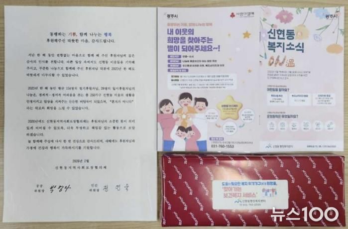 뉴스100 김동초 기자 | 광주시 신현동 지역사회보장협의체는 2025년 한 해 동안 신현동 내 어려운 이웃을 위해 성금과 물품을 기부한 후원자 183명에게 감사 서한을 발송했다고 12일 밝혔다.