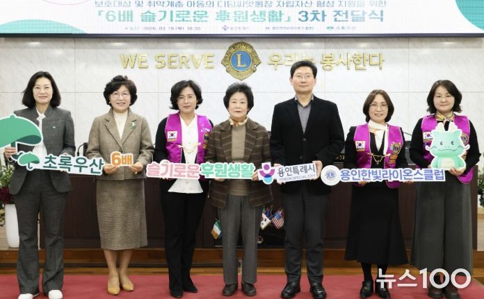 뉴스100 김동초 기자 | 용인특례시는 19일 오후 용인라이온스회관 3층에서 초록우산 어린이재단 경기1지역본부와 용인한빛라이온스클럽과 함께 ‘용인시 6배 슬기로운 후원생활’ 캠페인 3차 전달식을 열었다고 20일 밝혔다.