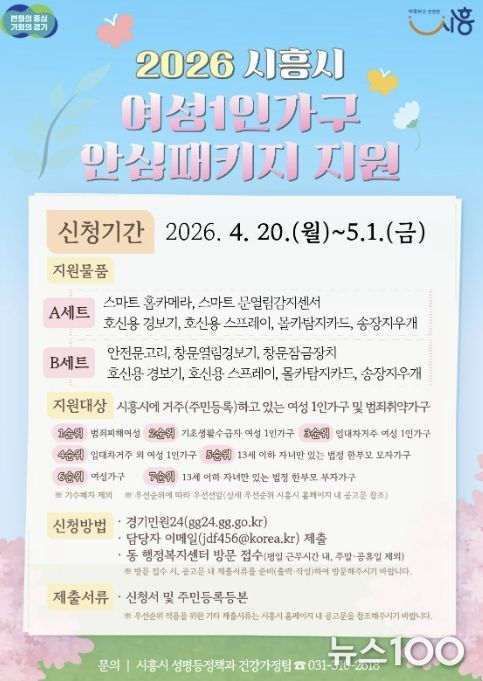뉴스100 김동초 기자 | 시흥시는 관내 여성 1인 가구 등의 안전한 일상 보호를 위해 ‘2026년 시흥시 여성 1인 가구 안심패키지 지원사업’을 추진하고, 오는 4월 20일부터 5월 1일까지 신청을 받는다.