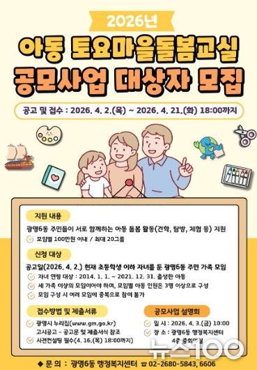 뉴스100 김동초 기자 | 광명시 광명6동 행정복지센터는 오는 21일까지 ‘2026년 아동 토요마을돌봄교실 공모사업’에 참여할 주민 가족 모임 20개 팀을 모집한다.