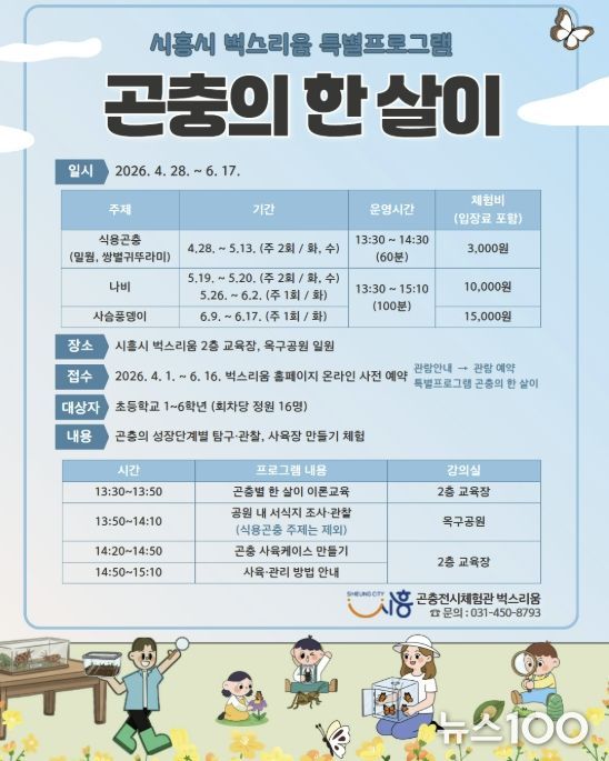 뉴스100 김동초 기자 | 시흥시 곤충체험전시관 ‘벅스리움’은 오는 4월 28일부터 6월 17일까지 초등학생을 대상으로 특별프로그램 ‘곤충의 한 살이’를 운영한다.