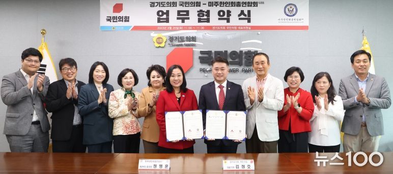 뉴스100 김동초 기자 | 경기도의회 국민의힘(대표의원 김정호)과 미주한인회총연합회sm(총회장 정명훈, 미주총련sm)가 26일 경기도의회 국민의힘 대표의원실에서 업무협약(MOU)을 체결했다.