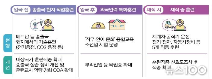 향후, 고용노동부는 외국인력 수요 분석을 고도화하여 내년도 고용허가제(E-9) 도입 규모를 예년보다 빨리(11월 중) 결정하고, 입국 전-후-재직 중 훈련을 통해 숙련인력을 조기 공급할 계획이다.