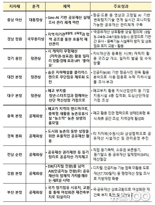 대통령상(1점)은 Geo-AI(지리정보 인공지능) 기술로 공유재산 변화를 자동으로 탐지하고, 실시간 분석가능 체계를 마련해 공유재산 실태조사를 효율적으로 추진한 충청남도 아산시가 수상했다.