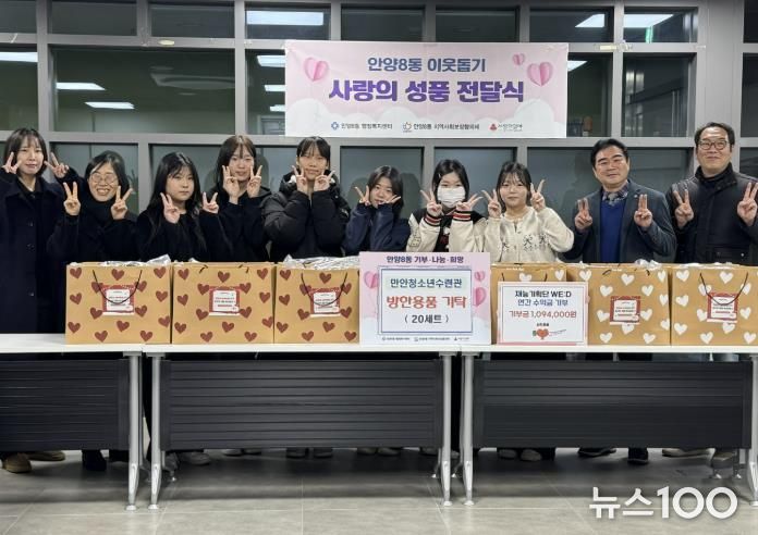 뉴스100 김동초 기자 | 안양시 만안구 안양8동 행정복지센터에 따르면 지난 18일 만안청소년수련관의 청소년 자치활동 프로그램 ‘재능기획단’이 관내 혼자 생활하는 어르신들에게 전달해달라며 센터에 1,094,000원 상당의 방한용품 20세트를 기탁했다고 23일 밝혔다.