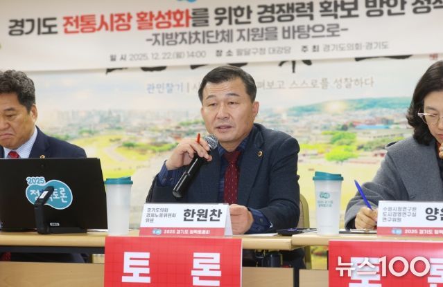 뉴스100 김동초 기자 | 경기도의회 경제노동위원회 소속 한원찬 의원(국민의힘, 수원6)은 22일 수원특례시 팔달구청 대강당에서 개최된 ‘경기도 전통시장 활성화를 위한 경쟁력 확보 방안 정책 토론회’에 토론자로 참석했다. 이번 토론회는 지방정부의 전통시장 및 상점가 육성을 위한 지원 방안 개선책을 모색하고, 경기도 전통시장이 단순한 활성화를 넘어 실질적인 경쟁력을 확보하기 위한 전략을 논의하고자 마련됐다.