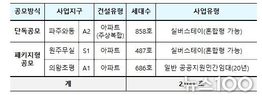 ②택지공모는 약 2천호 규모로 실시하며, 사업 대상지는 파주와동 A2 블록, 원주무실 S1 블록, 의왕초평 A1 블록 총 3곳이다. 파주와동 A2 블록과 원주무실 S1 블록은 실버스테이로, 의왕초평 A1 블록은 임대의무기간이 20년인 일반 공공지원민간임대로 공급한다.