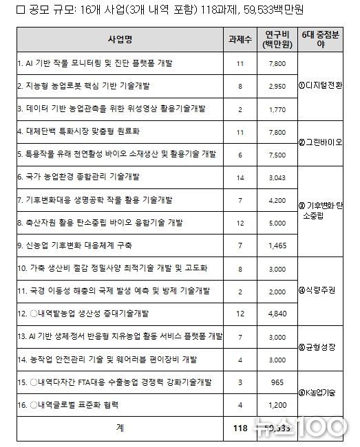 6대 분야는 다음과 같다. △미래 스마트농업 확산: 인공지능(AI) 기반 작물 모니터링 및 진단 플랫폼 개발, 위성영상 활용 기술 등(21과제, 약 125억 원) △바이오 및 푸드테크 산업 육성: 대체단백 특화시장 맞춤형 원료화, 특용작물 유래 바이오 소재 생산 등(17과제, 약 153억 원) △기후변화 및 탄소중립 대응: 축산자원 활용 탄소중립 기술, 신농업 기후변화 대응체계 구축 등 (40과제, 약 137억 원) △식량주권 확보: 밭농업 생산성 증대 기술, 가축 생산비 절감 정밀 사양 최적 기술 등 (22과제, 약 98억 원) △지역 균형성장 및 안전·행복한 농촌: 치유농업 활동 서비스 플랫폼 개발, 농작업 안전관리 및 웨어러블 장비 개발 등(11과제, 약 60억 원) △ 케이(K) 농업 국제적(글로벌) 확산: 다자간 자유무역협정(FTA) 대응 수출농업 경쟁력 강화 기술, 국제 표준화 협력 등(7과제, 약 22억 원)
