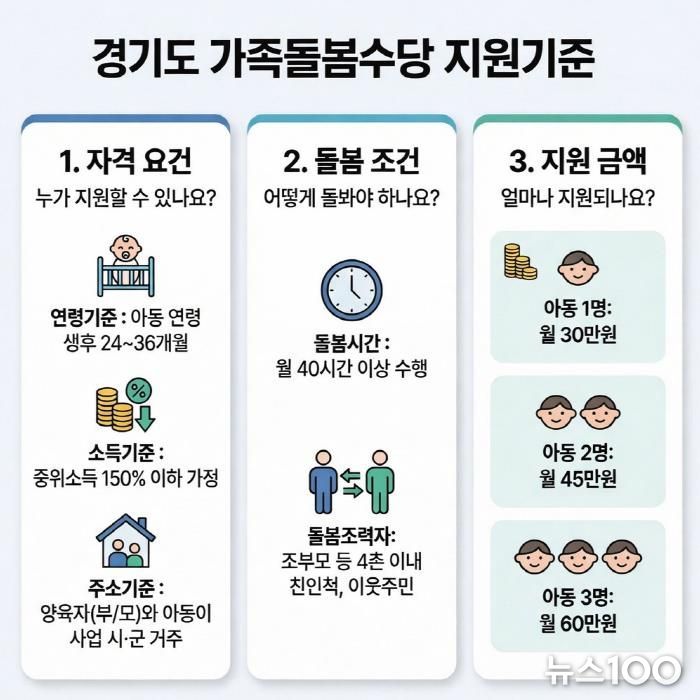 신청은 매월 1일부터 15일까지 경기민원24를 통해 온라인으로 가능하며, 돌봄활동 후 그다음 달에 수당이 지급된다.