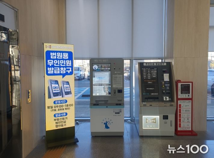 대법원 통합무인민원발급기는 ▲법인인감증명서 ▲법인등기사항증명서 ▲부동산등기사항증명서 등 법원 관련 민원서류 3종을 즉시 발급할 수 있는 기기로, 발급 수수료는 1통당 1,000원이며 운영시간은 평일 오전 9시부터 오후 6시까지다.