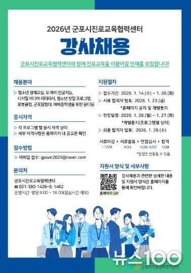 뉴스100 김동초 기자 | (재)군포시청소년재단 군포시진로교육협력센터는 관내 청소년의 진로 탐색과 진로 역량 강화를 위해 '2026년 군포시진로교육협력센터 강사'를 채용한다고 밝혔다.