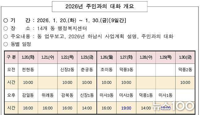 뉴스100 김동초 기자 | 하남시는 오는 1월 20일부터 30일까지 관내 각 동 행정복지센터를 순회하며 ‘2026년 주민과의 대화’를 개최한다고 밝혔다.