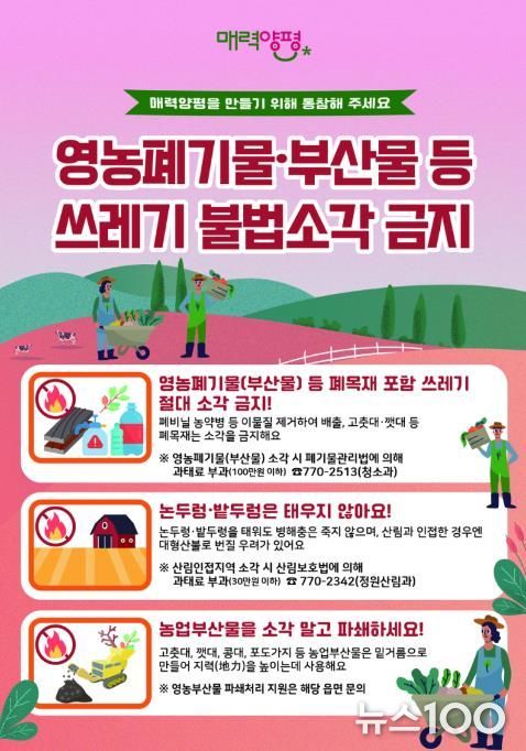 뉴스100 김동초 기자 | 양평군은 봄철을 맞아 대기오염 방지와 산불 예방을 위해 영농부산물 및 폐기물 불법소각에 대한 집중 단속 계획을 수립하고, 본격적인 단속에 나선다고 13일 밝혔다.