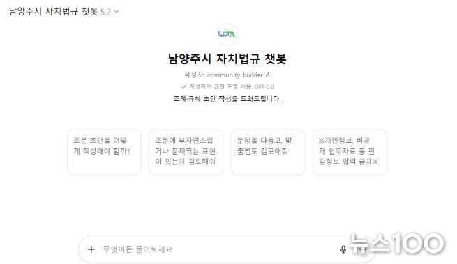 뉴스100 김동초 기자 | 남양주시는 이달부터 전 직원을 대상으로 자치법규 업무를 지원하는 생성형 인공지능(AI) 기반 ‘남양주시 자치법규 챗봇’ 운영을 시작했다고 14일 밝혔다.