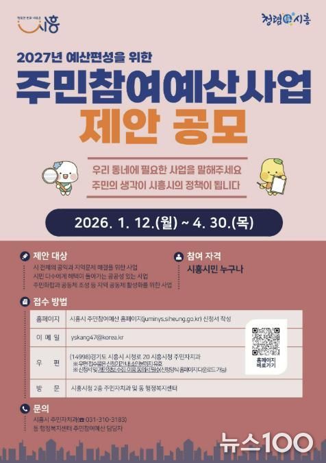 뉴스100 김동초 기자 | 시흥시는 오는 4월 30일까지 주민들이 직접 사업을 제안하는 ‘시흥시 주민참여예산 제안’을 신청받는다.
