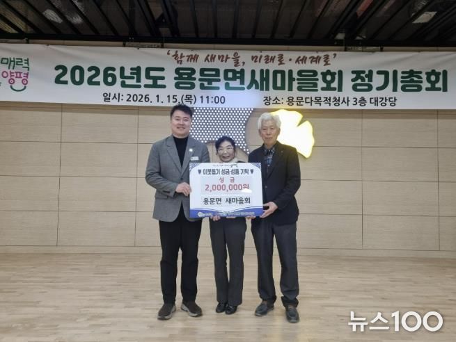 뉴스100 김동초 기자 | 양평군 용문면은 지난 15일 용문면새마을회가 새해를 맞아 지역 내 어려운 이웃을 돕기 위한 성금 200만 원을 기탁하며 따뜻한 나눔을 실천했다고 밝혔다.