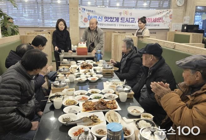 뉴스100 김동초 기자 | 수원시 장안구 연무동은 지난 15일 이교수한정식과 생신을 맞은 저소득 어르신들에게 따뜻한 한 끼를 대접하고 축하의 마음을 전하는 나눔 활동을 진행했다.