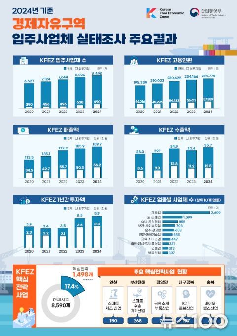 뉴스100 김동초 기자 | '2024년 기준 경제자유구역 입주사업체 실태조사'에 따르면 경제자유구역이 외국인투자기업 증가와 고용·투자 등이 크게 확대되며 지역경제의 핵심 성장거점으로서의 역할을 톡톡히 하는 것으로 나타났다.