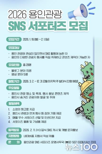 뉴스100 김동초 기자 | 용인특례시는 2월 1일까지 용인의 관광자원과 다채로운 축제·행사를 시민의 시각에서 생동감 있게 홍보할 ‘용인관광 SNS 서포터즈’를 모집한다고 20일 밝혔다.