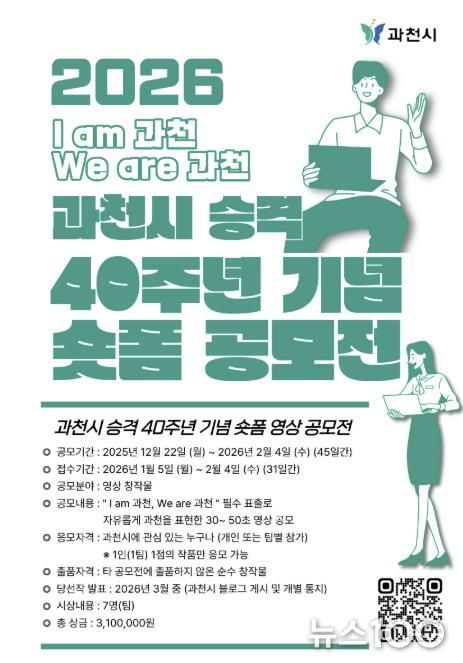 뉴스100 김동초 기자 | 과천시는 시 승격 40주년을 맞아 ‘숏폼 영상 공모전’을 개최하고, 오는 2월 4일까지 작품을 모집한다고 밝혔다.