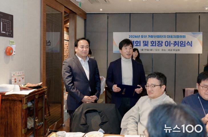 뉴스100 김동초 기자 | 오산시 가장산업단지 기업인협의회는 지난 19일 정기 오찬간담회에서 2026년 신년회 및 회장 이·취임식을 개최했다고 밝혔다.