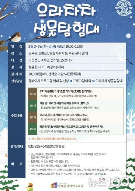 뉴스100 김동초 기자 | 칠보생태환경체험교육관이 겨울방학 프로그램 ‘으라차차 생물탐험대(겨울 탐조프로젝트)’에 참여할 초등학교 1~4학년 어린이 15명을 선착순으로 모집한다.