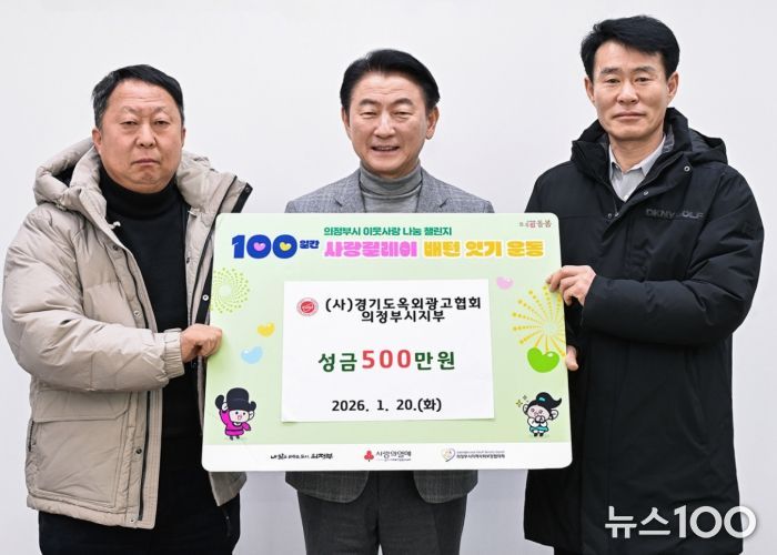뉴스100 김동초 기자 | 의정부시는 1월 20일 (사)경기도옥외광고협회 의정부시지부가 ‘100일간 사랑릴레이 배턴 잇기’에 동참해 성금 500만 원을 기탁했다고 밝혔다.