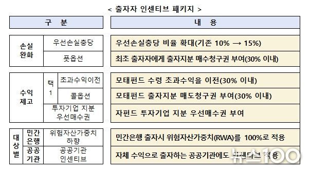 지역사회가 참여하는 모펀드별 ‘운영위원회’를 설치하고 지역투자 재원 확보를 위해 출자자 인센티브 패키지를 제공한다. 인센티브는 손실은 낮게, 수익은 높게, 대상은 넓게 설정한다. 지역 기반 벤처캐피탈 육성을 위한 지역운용사 인센티브도 운영할 계획이다.
