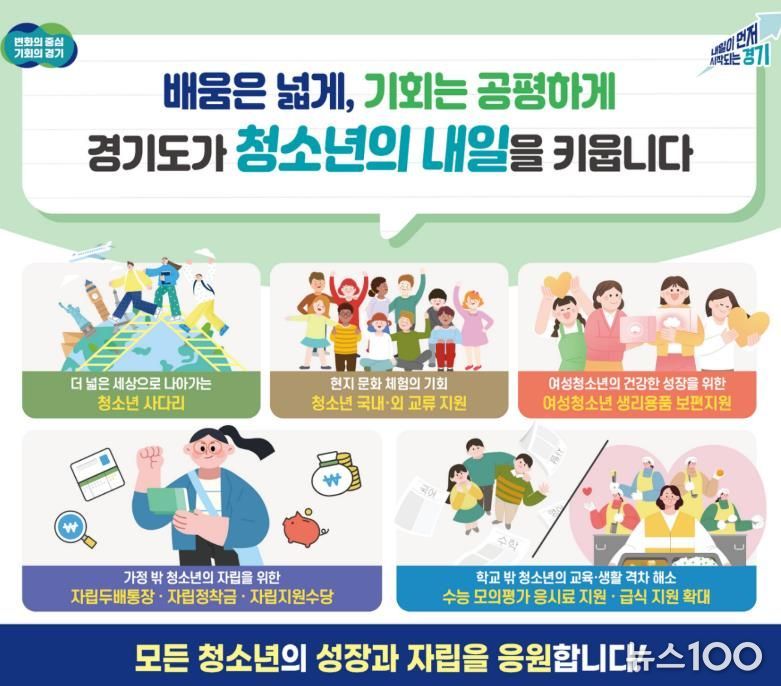 뉴스100 김동초 기자 | 경기도가 청소년의 건강한 성장과 배움 기회, 생활 안정을 위해 급식, 학습·진로·자립 지원까지 아우르는 다양한 정책을 추진한다.