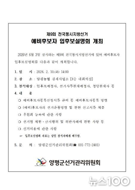 뉴스100 김동초 기자 | 양평군선거관리위원회는 2월 10일 14:00 양평농협 경제사업소 3층 대회의실에서 2026. 6. 3. 실시하는 제9회 전국동시지방선거와 관련하여 입후보예정자들에게 (예비)후보자등록 및 선거운동방법 등에 관한'예비후보자 입후보설명회'를 개최한다고 밝혔다.